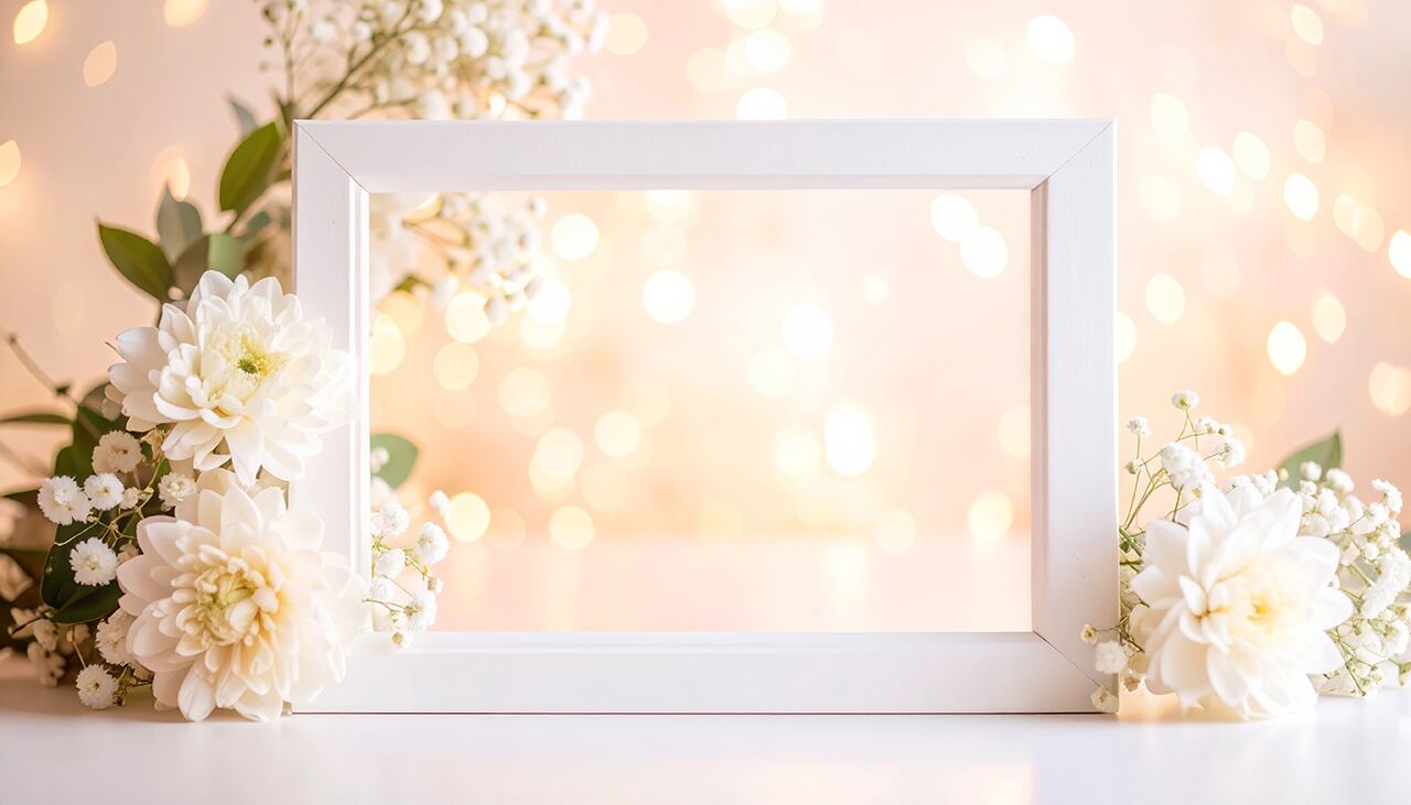 白い花と温かな光がふんわりと浮かぶ上品な背景素材。